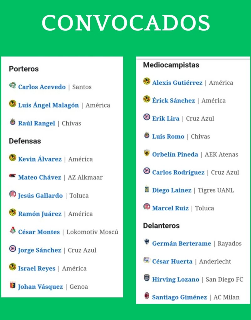 Para estos partidos amistosos, el vasco a presentado la convocatoria con 25 futbolistas, en esta convocatoria destacan ausencias, tales como la de Raúl Jiménez del Fulham, Julián Araújo del Bormouth, Jesús Chiquete Orozco de Cruz azul y el capitán méxicano Edson Álvarez del Fenerbahce, pero posibilito el regreso de futbolistas a la selección, tales como los de Carlos Acevedo Y Julián Quiñones, quienes no estuvieron en convocatorias anteriores.