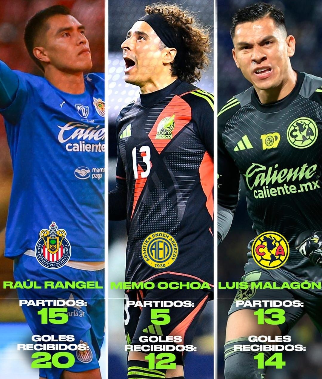 Raúl «Tala» Rangel, el jovén portero de las Chivas ha logrado hacerse con el puesto de titular en la escuadra tapatía logrando llegar con sus buenas actuaciones a ser llamado a ala Selección, sin embargo no logra convencer del todo pues en sus últimos partidos con la selección le han anotado en 5 partidos un total de 13 goles, y con Chivas ha jugado 16 y recibido 20.